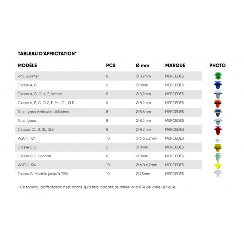 Placé sur un éléments de carrosserie ces clips vous permettront de fixer : panneaux de portes, moulures, habillages plastiques divers des véhicules MERCEDES
