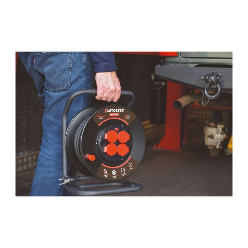 Cet enrouleur permet d'alimenter des appareils électriques dans des zones où la prise de courant n'est pas facilement accessible. Il offre une longueur de câble de 25m et dispose 4 prises 16A+T à clapet. Il est muni d'une poignée pour le transport et d'une manivelle pour dérouler et enrouler le câble. IP44, il est adapté à un usage en extérieur ou dans des environnements humides comme sur les chantiers. Pour plus de sécurité, il est doté d'un disjoncteur thermique.